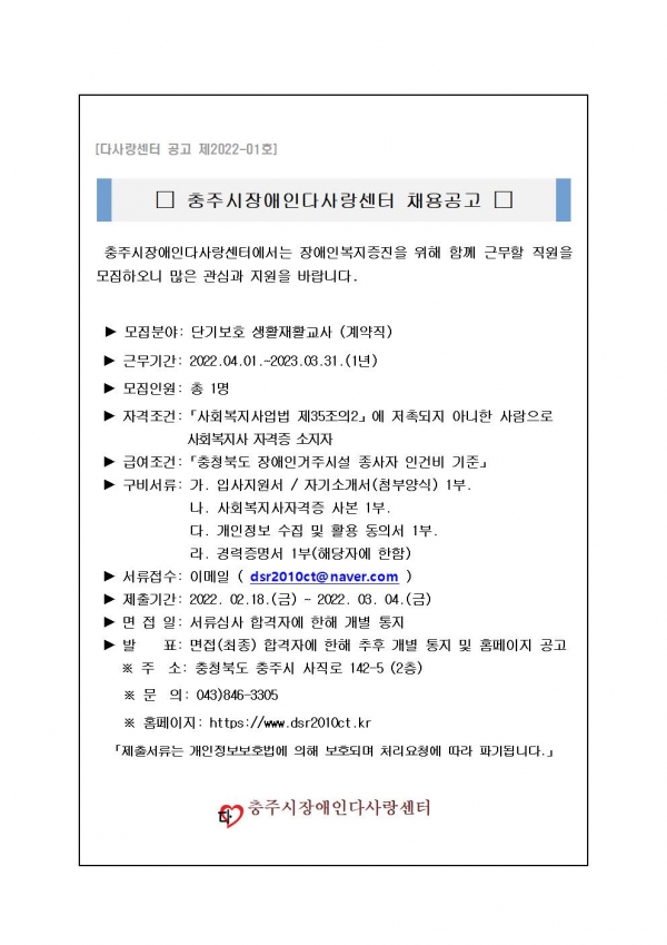 단기보호 생활재활교사 (계약직 1년) 모집 공고