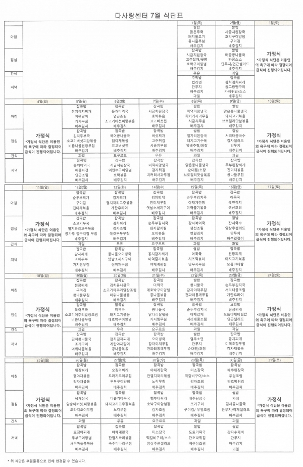 7월 식단표 페이지 정보 작성일 : 21-07-26 09:20 조회 : 1,007회 관련링크 본문 식단표게시가 많이 늦었습니다~ 댓글목록 등록된 댓글이 없습니다. 이전글 다음글 목록
