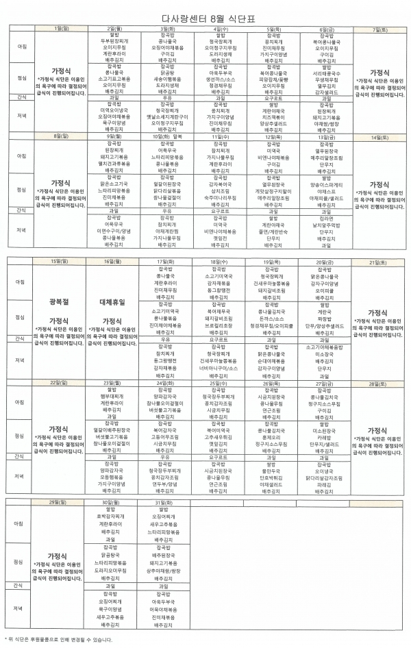 충주시장애인다사랑센터 8월 식단표를 공유합니다