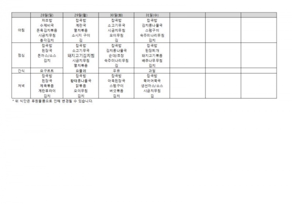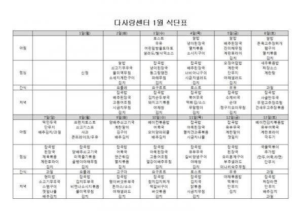 2018년 1월 식단표입니다.