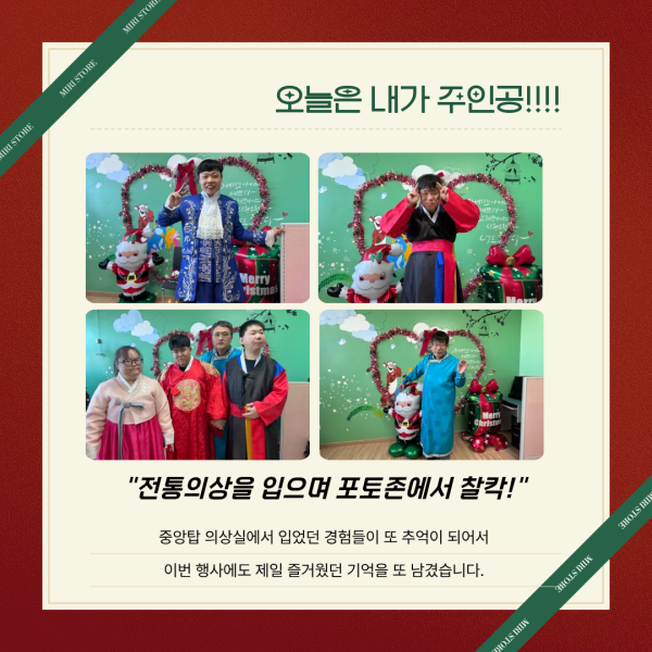 다사랑 송년회 페이지 정보 작성자 이하영 작성일25-12-04 17:23 조회86회 댓글0건 관련링크 본문 다사랑 송년회 프로그램을 통해 센터 이용인들이 즐겁고 알찬 행사를 참여할 수 있었습니다. 다사랑센터를 위해 후원해주시고 봉사해주시는 분들이 있기 때문에 이 자리가 마련되었던거 같습니다. 올해도 정말 감사했습니다. 댓글목록 등록된 댓글이 없습니다. 이전글 다음글 목록