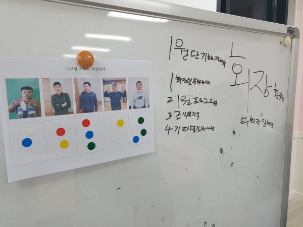 단기보호 자치회 페이지 정보 작성자 안준수 작성일21-05-21 15:23 조회1,908회 댓글0건 관련링크 본문 2021. 01. 07. (목)단기보호 자치회를 실시하였습니다.2021년 임원을 새로 뽑았는데 회장으로 황준원이용인이, 부회장으로 임채진이용인이 당선 되었습니다. 회장 소감으로 "내가 이제 회장이다"라고 선언 하였고, 부회장 소감으로 "열심히 하겠습니다"라고 발표하였습니다. 상반기 동안 잘 이끌어 갈 수 있도록 많이 응원해 주세요. 댓글목록 등록된 댓글이 없습니다. 이전글 다음글 목록