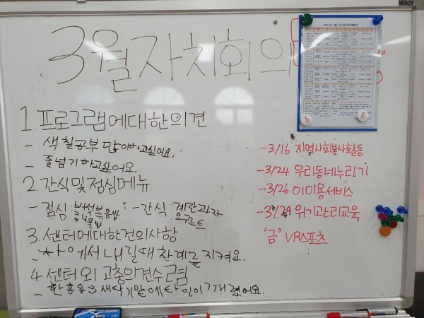 지난 1년 동안 주간 이용인 자치회를 이끌어주신 회장 한흥용씨, 부회장 이종건씨의 퇴임 인사말 시간을 가져보았습니다. 주간회장 한흥용씨는 "질문의 답변을 잘 해주어서 감사합니다." 라는 감사 인사를 전하였고, 주간부회장 이종건씨는 "회장을 하고 싶어요." 라며 재출마 의사를 밝혔습니다.^___^~* 두 분 모두 1년 동안 고생 많으셨습니다.♡