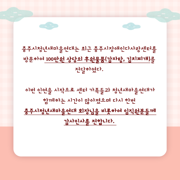 충주시장애인다사랑센터 특별한 물품 후원 페이지 정보 작성자 이하영 작성일24-06-20 17:38 조회801회 댓글0건 관련링크 본문 댓글목록 등록된 댓글이 없습니다. 이전글 다음글 목록