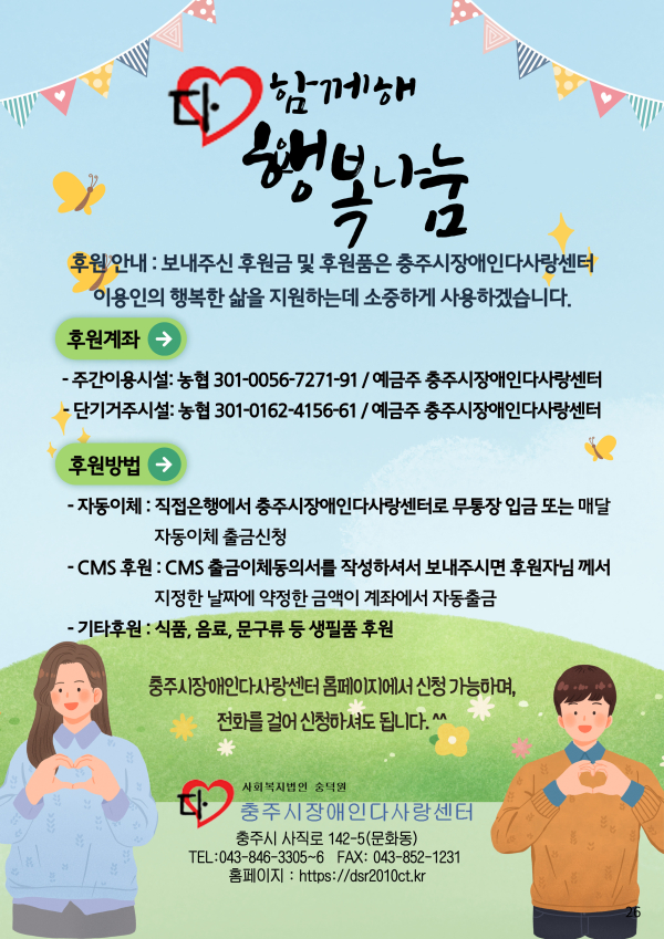 24년 여름호 (vol.52) 다사랑 뉴스레터 페이지 정보 작성자 이재호 작성일24-07-10 11:11 조회843회 댓글0건 관련링크 본문 2024년 2분기 소식지가 발행되었습니다. 항상 따뜻한 관심과 성원을 보내주신 여러분께 감사드립니다. 댓글목록 등록된 댓글이 없습니다. 이전글 다음글 목록
