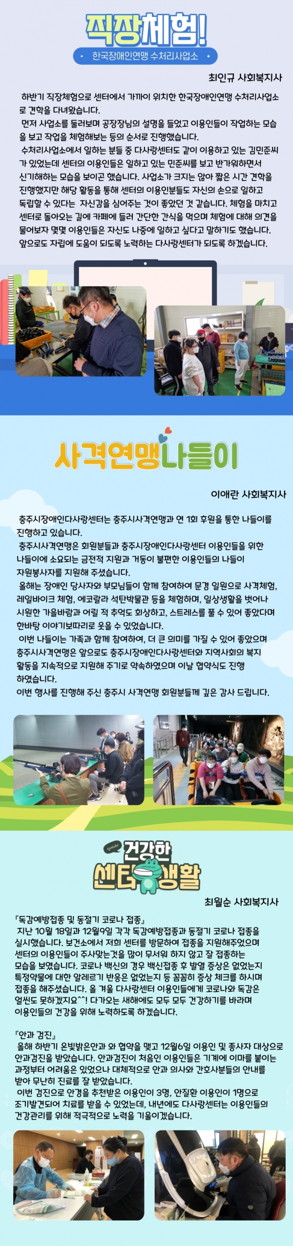 22년 겨울호 (vol.46) 다사랑 뉴스레터 페이지 정보 작성자 최인규 작성일23-01-19 13:40 조회642회 댓글0건 관련링크 본문 2022년 4분기 다사랑 뉴스레터입니다. 22년 한 해동안 많은 관심과 사랑을 주셔서 감사합니다. 댓글목록 등록된 댓글이 없습니다. 이전글 다음글 목록
