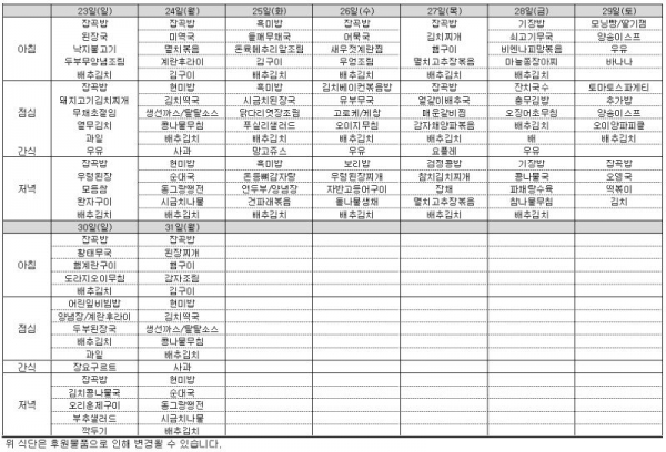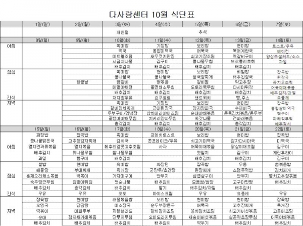 2017년 10월 식단표 입니다. 페이지 정보 작성일 : 17-10-11 01:11 조회 : 1,214회 관련링크 본문 * 위 식단표는 물품 수급 사정에 따라서 변경 될 수 있습니다. 댓글목록 등록된 댓글이 없습니다. 이전글 다음글 목록