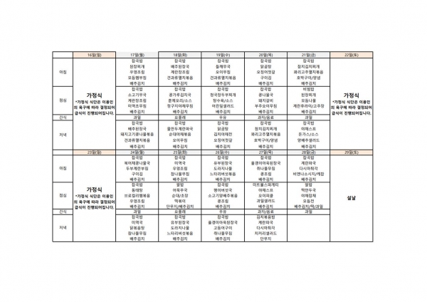 22년 1월 급식 식단표