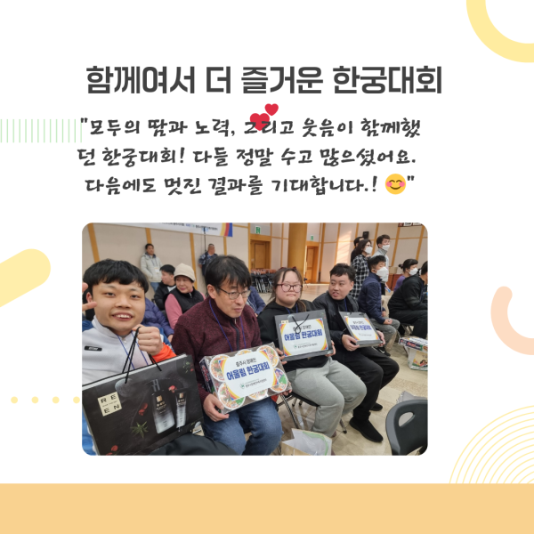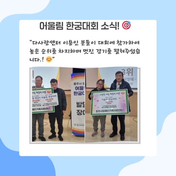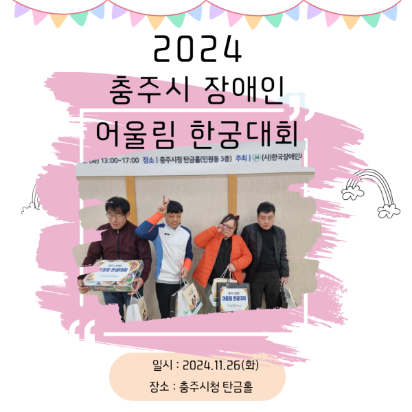 2024 충주시 장애인 어울림 한궁대회 소식! 페이지 정보 작성자 이재호 작성일24-11-30 03:01 조회561회 댓글0건 관련링크 본문 2024 충주시 장애인 어울림 한궁대회 소식! 댓글목록 등록된 댓글이 없습니다. 이전글 다음글 목록