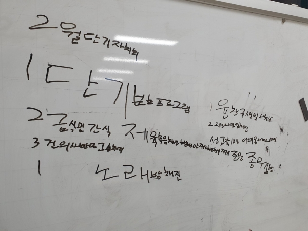 단기보호 자치회 페이지 정보 작성자 안준수 작성일21-05-21 15:27 조회1,904회 댓글0건 관련링크 본문 2021. 02. 04. 목단기보호 자치회이번 달엔 신규사업 우리동네 누리기와 위기관리교육, 차량안전교육, 성교육, 이미용서비스, 윤창규이용인과 임채진이용인의 생일파티 등이 준비되어 있다고 알려 주었어요. 생일이 아닌 이용인들이 다들 부러워 하네요.오늘은 특별히 건의사항 및 고충처리에 대한 의견이 나왔어요. 노래방을 하고 싶다는 의견이 나왔답니다. 의견을 반영하여 노래방 시간을 가지도록 해야겠어요^^ 댓글목록 등록된 댓글이 없습니다. 이전글 다음글 목록