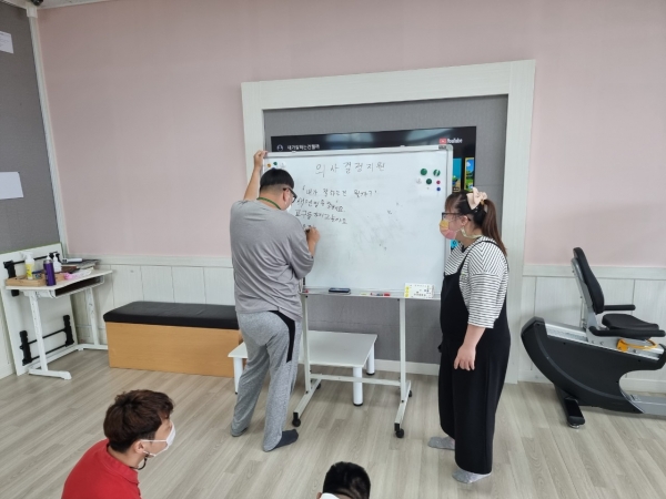 2021. 07. 05. 의사결정지원 페이지 정보 작성자 이하영 작성일21-07-05 17:59 조회1,678회 댓글0건 관련링크 본문 의사결정지원을 진행하였습니다.내가 잘하는 것은 무엇인가?를 논의해보았습니다.센터 내에서 이용인들이 같이 생각을 하면서 적어보았습니다.다사랑 이용인들 멋지지 않나요?^^ 댓글목록 등록된 댓글이 없습니다. 이전글 다음글 목록