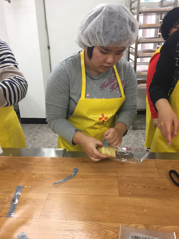 비닐을 뜯어 빵을 넣고 포장작업까지 열심히 하는 모습이 보이시나요?