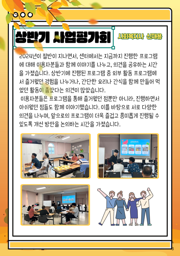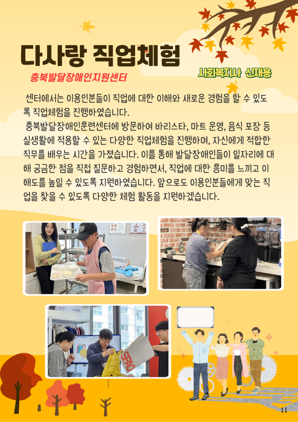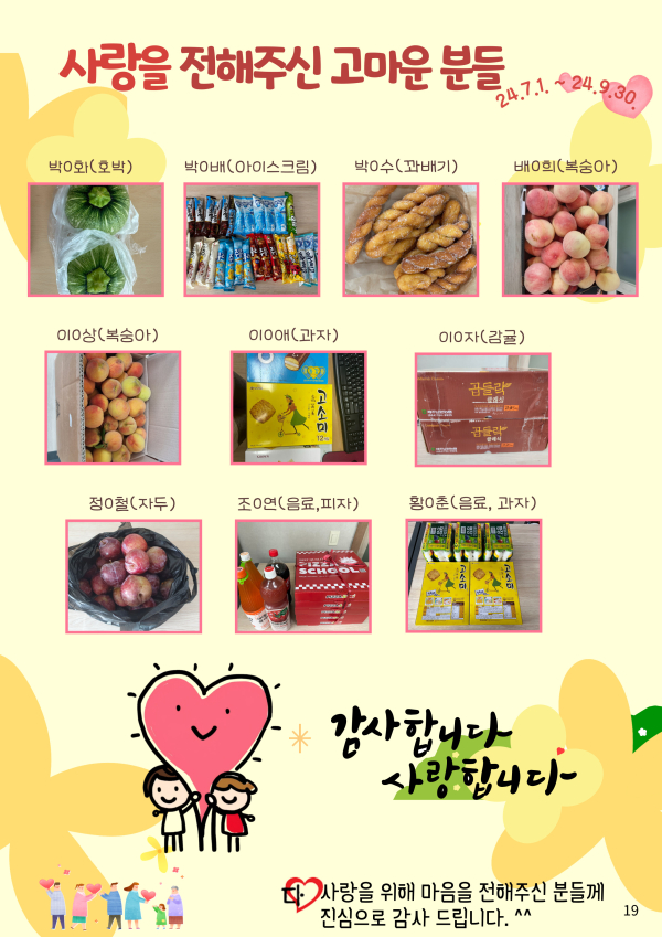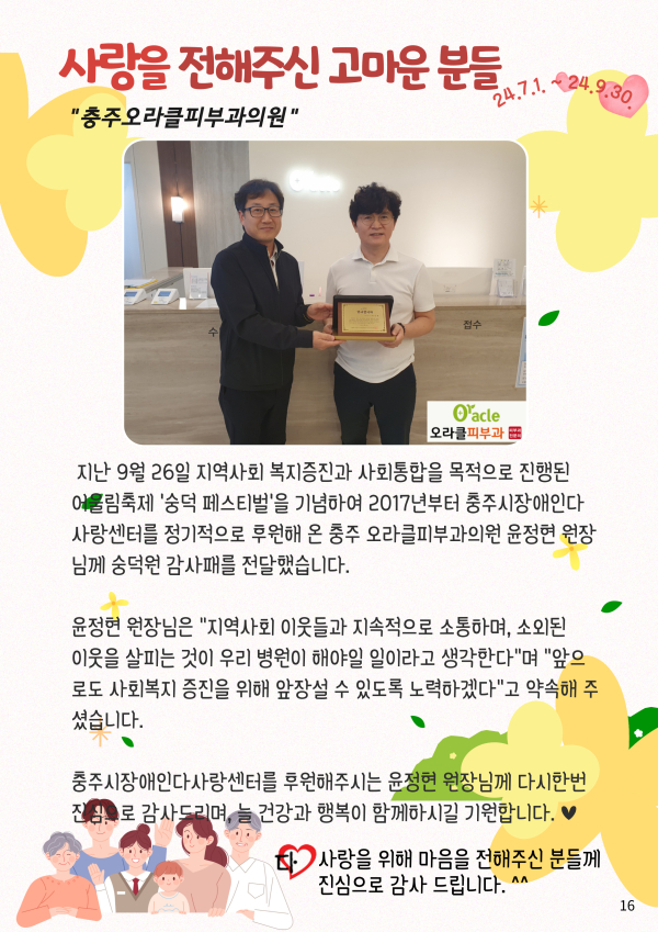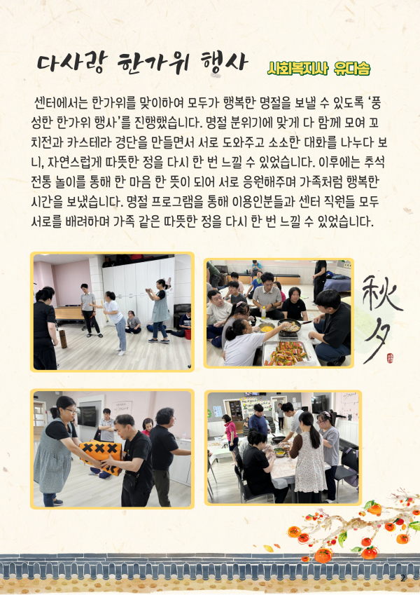 24년 가을호 (vol.53) 다사랑 뉴스레터 페이지 정보 작성자 이재호 작성일24-10-14 10:23 조회689회 댓글0건 관련링크 본문 2024년 3분기 소식지가 발행되었습니다. 항상 따뜻한 관심과 성원을 보내주신 여러분께 감사드립니다. 댓글목록 등록된 댓글이 없습니다. 이전글 다음글 목록