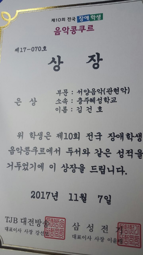 제 10회 전국 장애학생 음악콩쿠르 대회에서 별빛야간보호 김건호학생이 서양음악(관현악)부분에서 은상을 수상하였습니다.