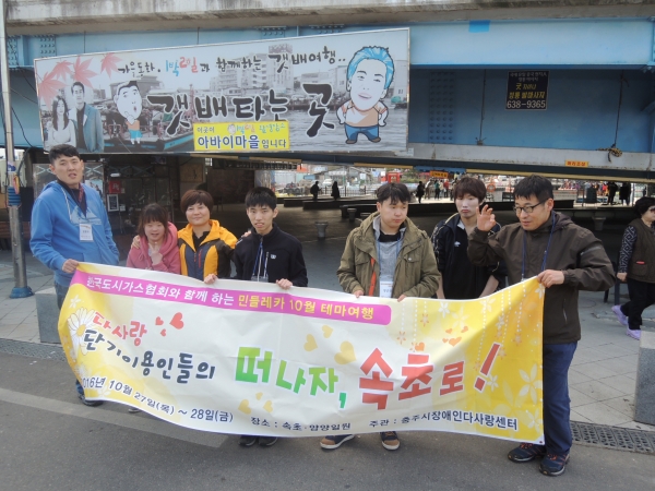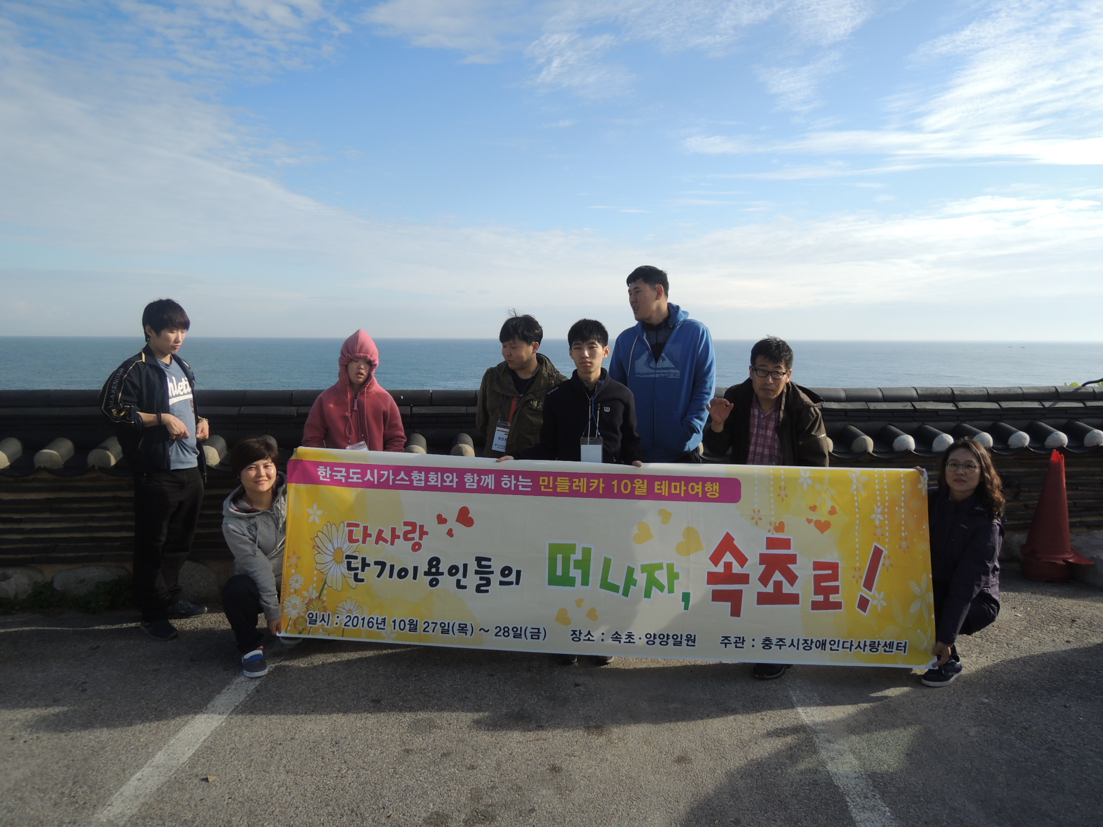 지난 10월 다사랑센터 단기이용인들과 함께 1박2일 속초를 다녀왔습니다. 민들레카테마여행은 차량과 유류, 일부 경비를 한국도시가스협회와 도시가스사업자가 지원하는 사업입니다. 지원되는 차량에 한계가 있어 많은 이용인들과 함께 하지 못해 아쉬웠지만 다음을 기약하며 사진을 올려봅니다. ^^