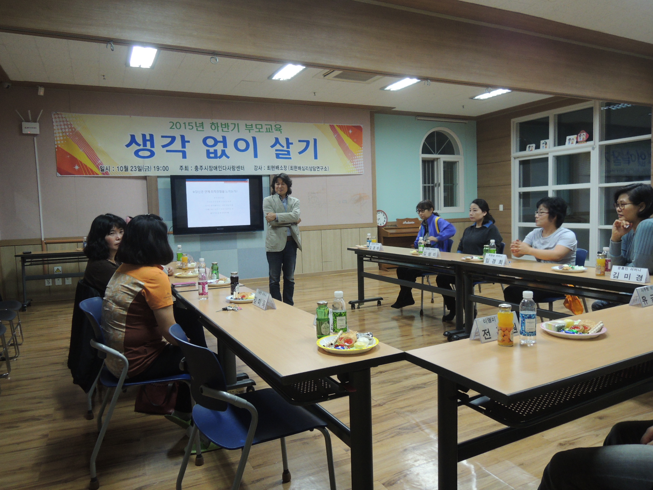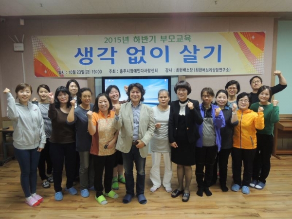 15.10.23. 부모교육 페이지 정보 작성자 심언석 작성일15-11-11 08:22 조회2,202회 댓글0건 관련링크 본문 10월 23일 충주시장애인다사랑센터에서 최현배 소장(최현배심리상담연구소)님을 모시고 ‘생각 없이 살기’란 주제로 2015년도 하반기 부모교육 및 간담회를 실시하였습니다. 이번 부모교육에서는 ‘나는 왜 살까, 그리고 어떻게 살까?’라는 기본적인 질문을 통해 그동안의 삶을 정리해 보고, 복잡한 내 머릿속을 단순하고 의미 있게 만드는 방법을 모색해보는 시간을 가져 보았습니다. 댓글목록 등록된 댓글이 없습니다. 이전글 다음글 목록