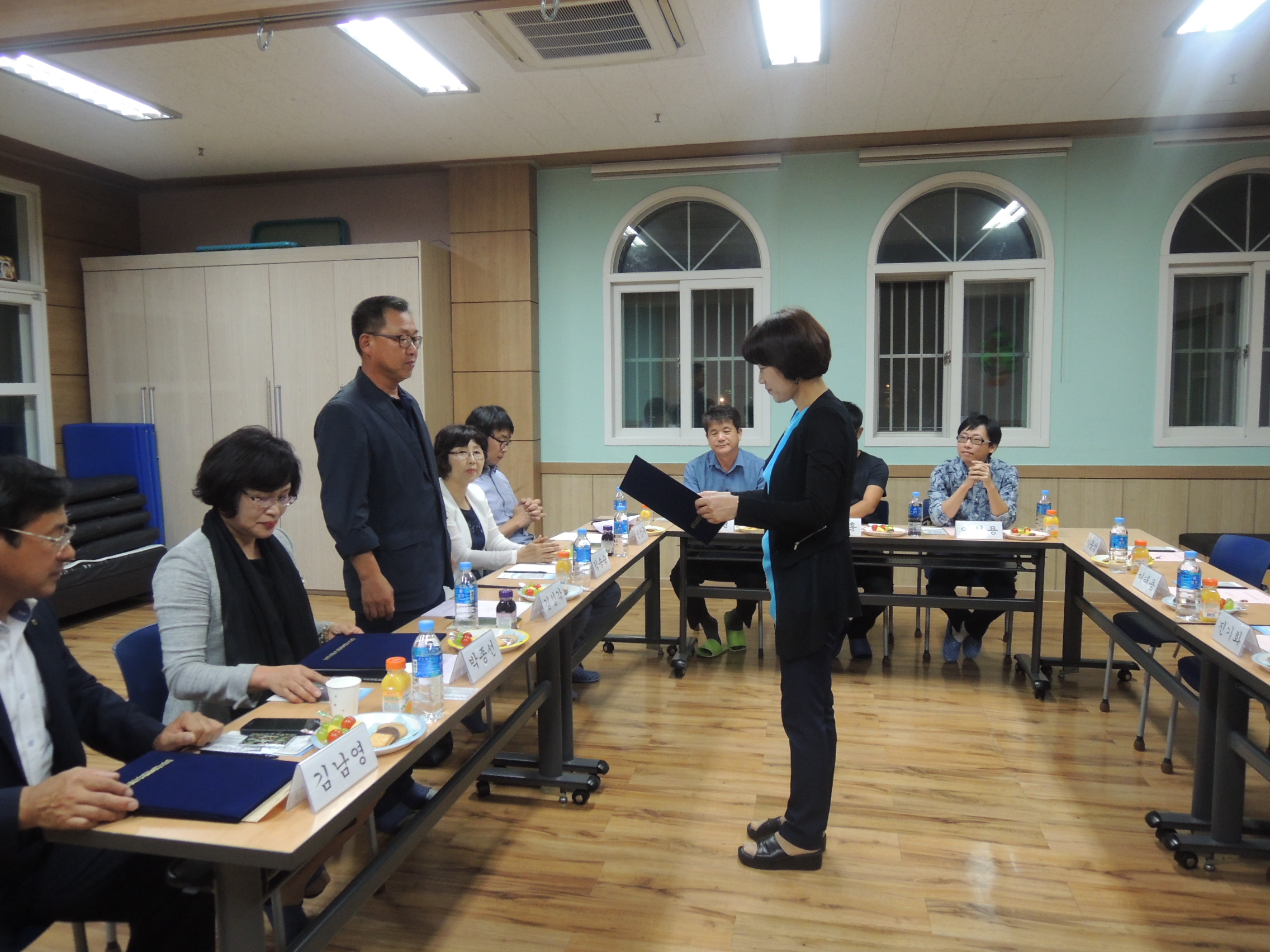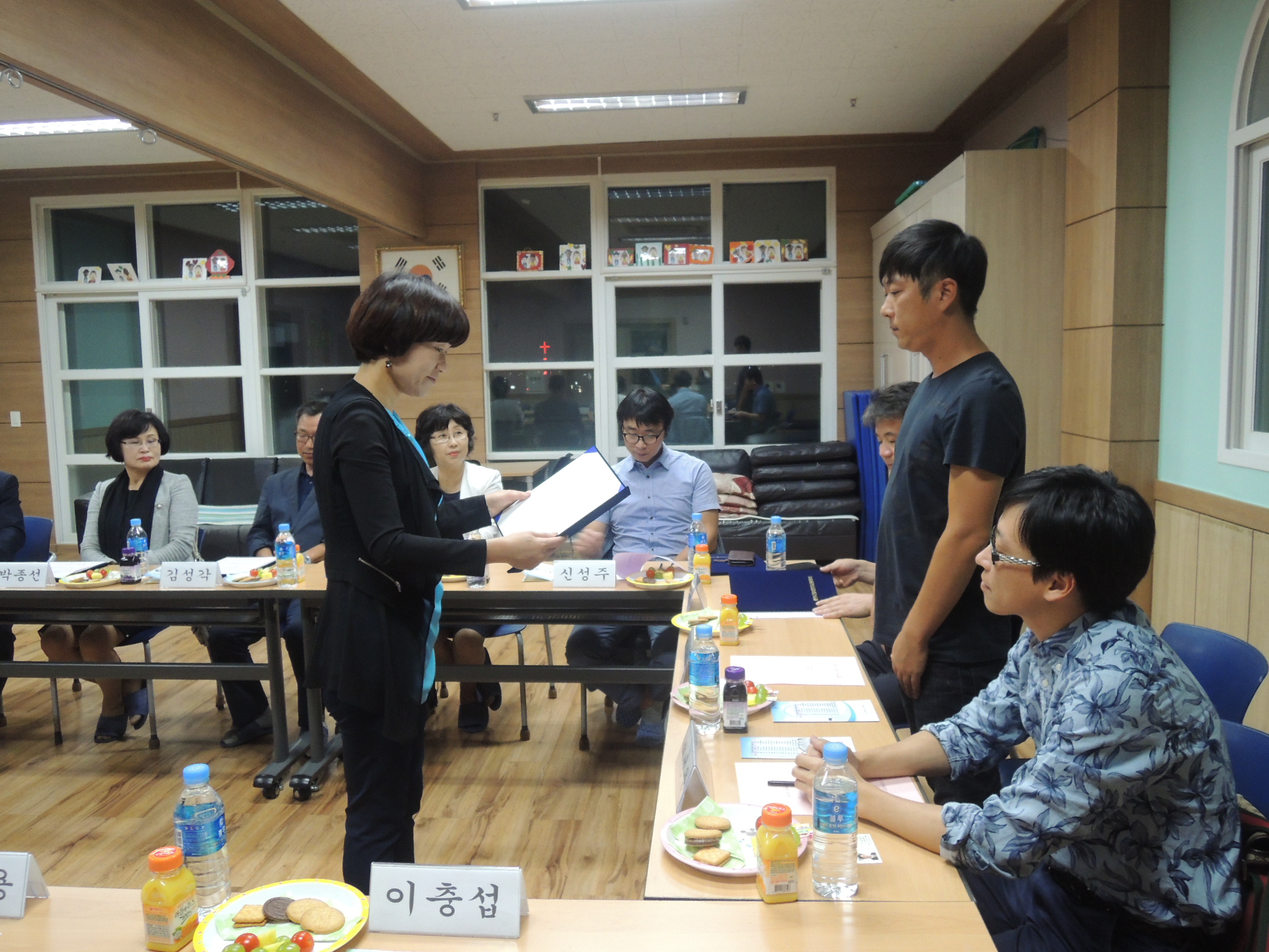 2015년 9월16일(수) 제15차 자문위원회 페이지 정보 작성자 김경선 작성일15-09-17 04:50 조회1,833회 댓글0건 관련링크 본문 제15차 자문위원회가 센터에서 진행되었습니다.새로 임기가 시작되는 시기여서 위촉장 전달식 및 임원선출이 이루워지는 자리이기도 했습니다.그동안 고생하신 전임 박종선 위원장님 외 임원들께 감사를 드리고 새로 선출되신 김남영 위원장님 외 임원들께는 앞으로의 활약을 응원하겠습니다.센터 발전을 위해 노력하는 다사랑자문위원회 위원님들 모두 고맙습니다. 댓글목록 등록된 댓글이 없습니다. 이전글 다음글 목록