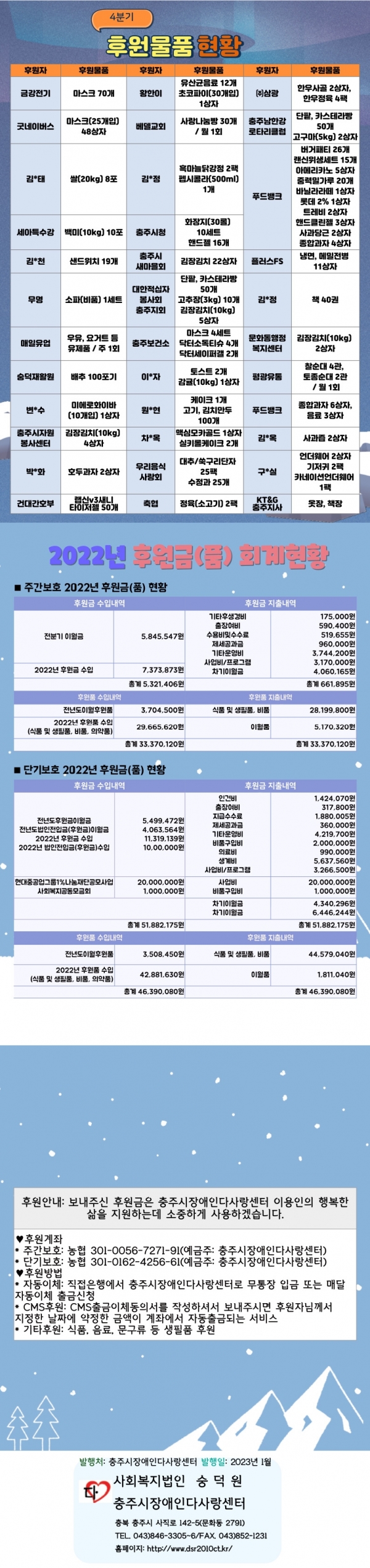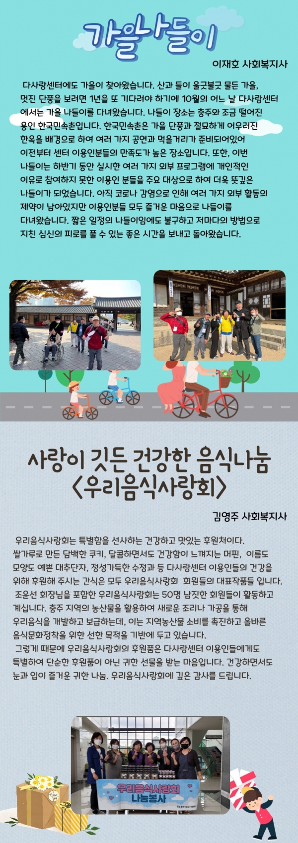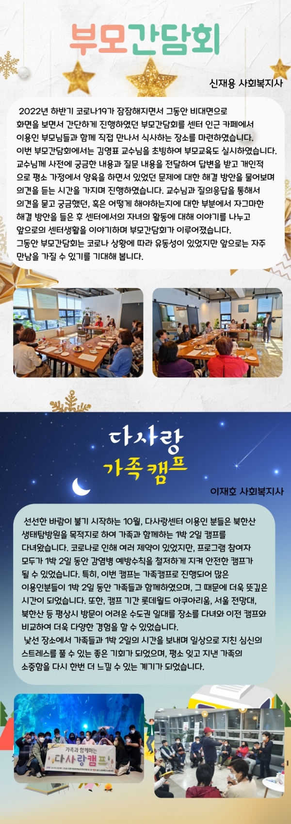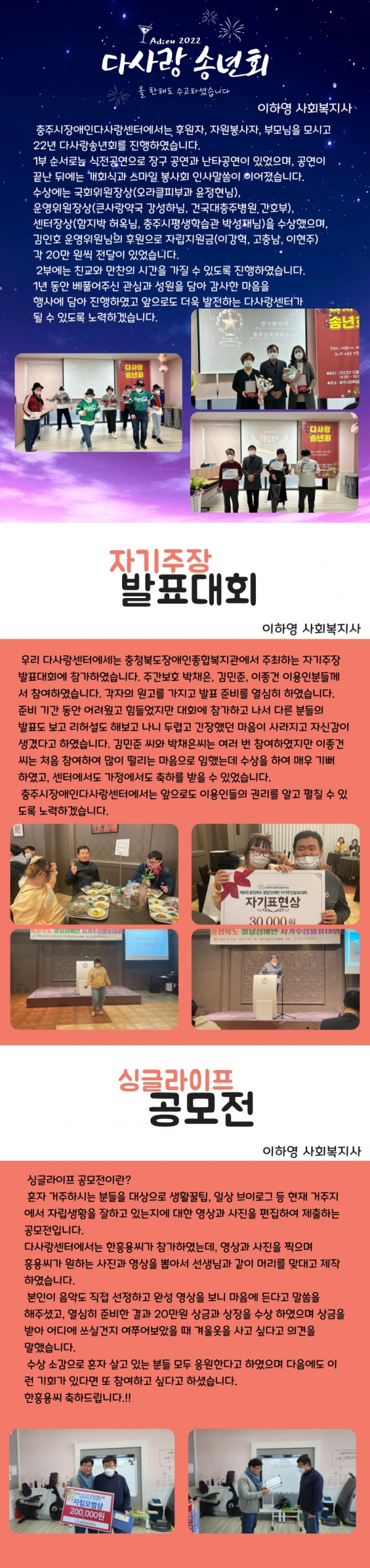 22년 겨울호 (vol.46) 다사랑 뉴스레터 페이지 정보 작성자 최인규 작성일23-01-19 13:40 조회654회 댓글0건 관련링크 본문 2022년 4분기 다사랑 뉴스레터입니다. 22년 한 해동안 많은 관심과 사랑을 주셔서 감사합니다. 댓글목록 등록된 댓글이 없습니다. 이전글 다음글 목록