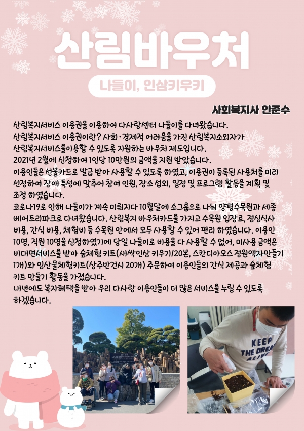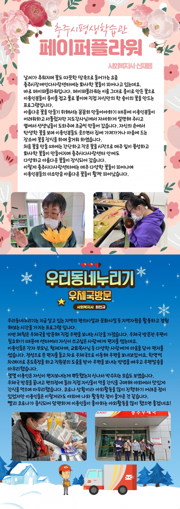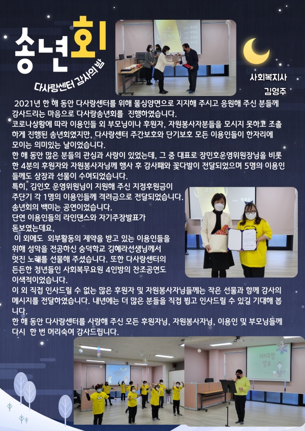 22년 1월호 (vol.42) 다사랑 뉴스레터 페이지 정보 작성자 최인규 작성일22-01-06 15:23 조회1,226회 댓글0건 관련링크 본문 댓글목록 등록된 댓글이 없습니다. 이전글 다음글 목록