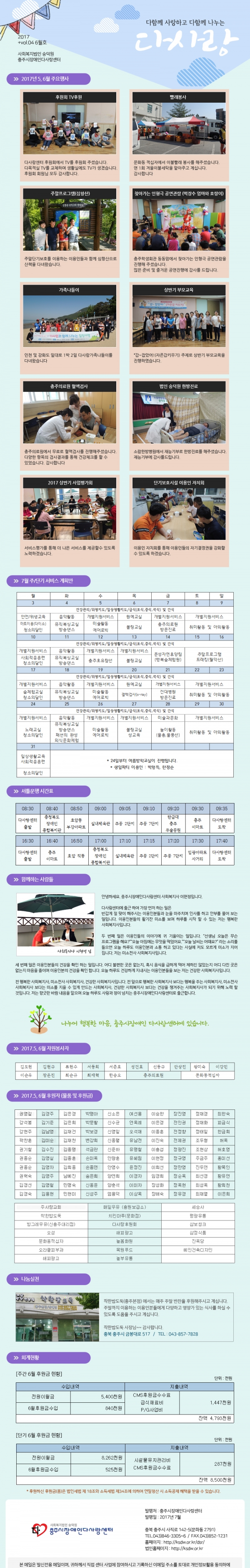 17년 6월호 (vol.5) 다사랑 뉴스레터 페이지 정보 작성자 김영실 작성일17-07-14 00:40 조회1,238회 댓글0건 관련링크 본문 댓글목록 등록된 댓글이 없습니다. 이전글 다음글 목록