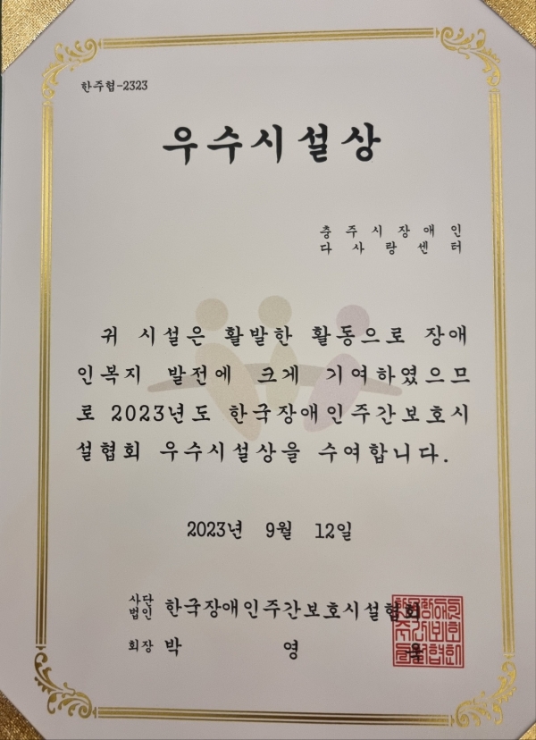 충주시장애인다사랑센터, 2023년 한국장애인주간보호시설협회, 시설장 대회 '우수시설상 수상'