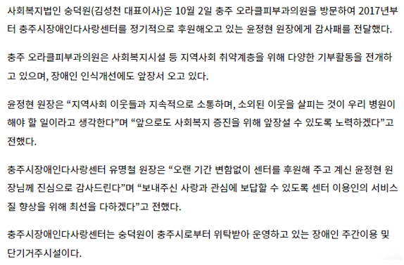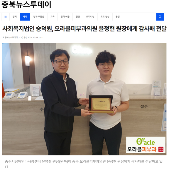충주 숭덕원, 오라클피부과의원 윤정현 원장에게 후원 감사패 전달 페이지 정보 작성자 이재호 작성일24-10-05 12:45 조회399회 댓글0건 관련링크 본문 출처 : 충북뉴스투데이(http://www.cbnewstoday.co.kr) 댓글목록 등록된 댓글이 없습니다. 이전글 다음글 목록