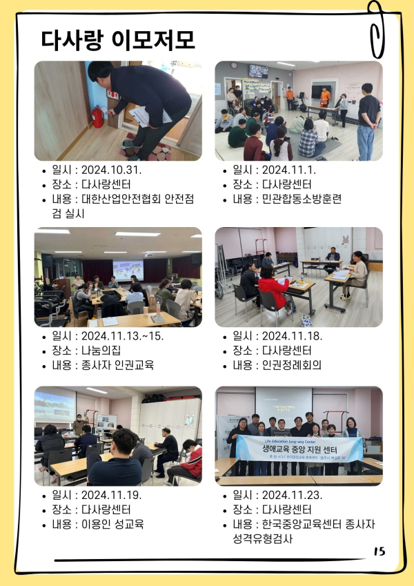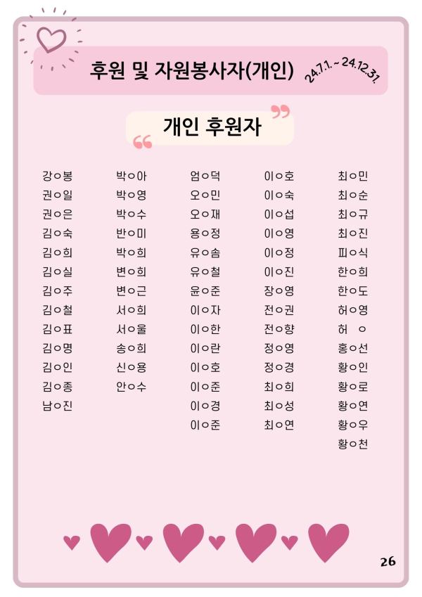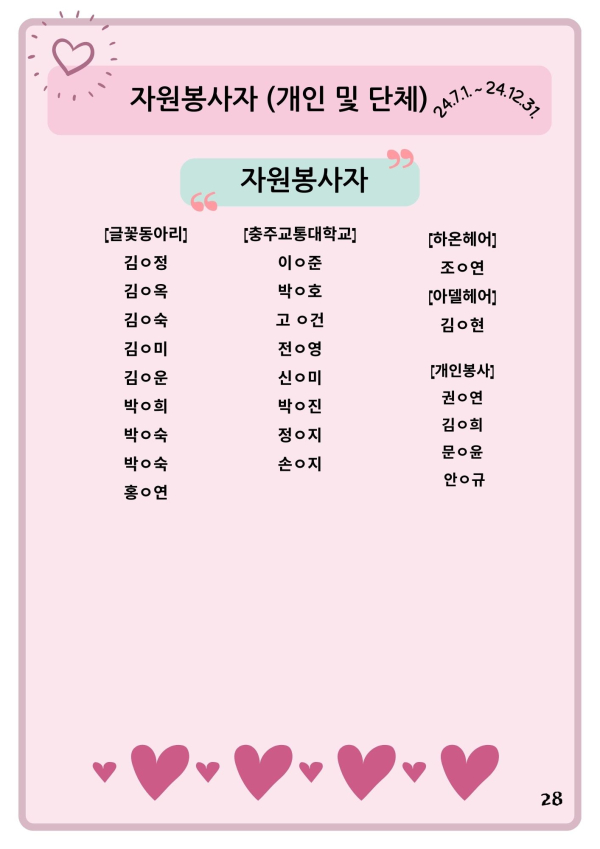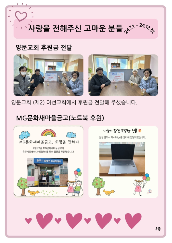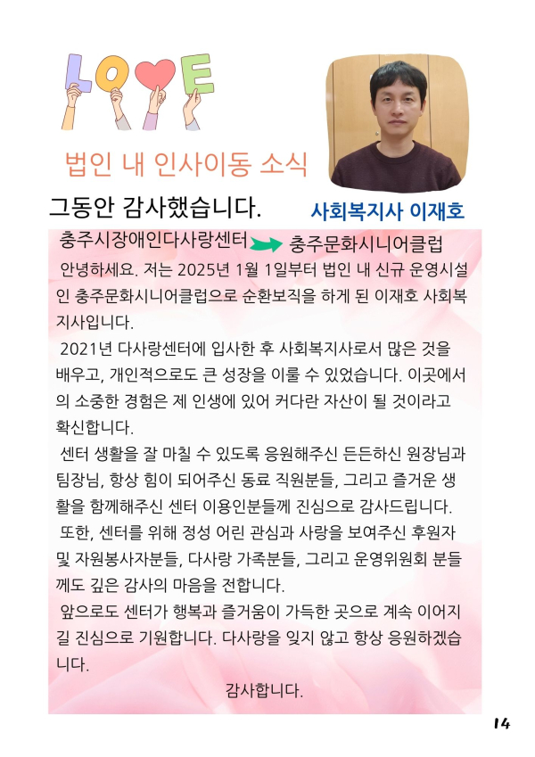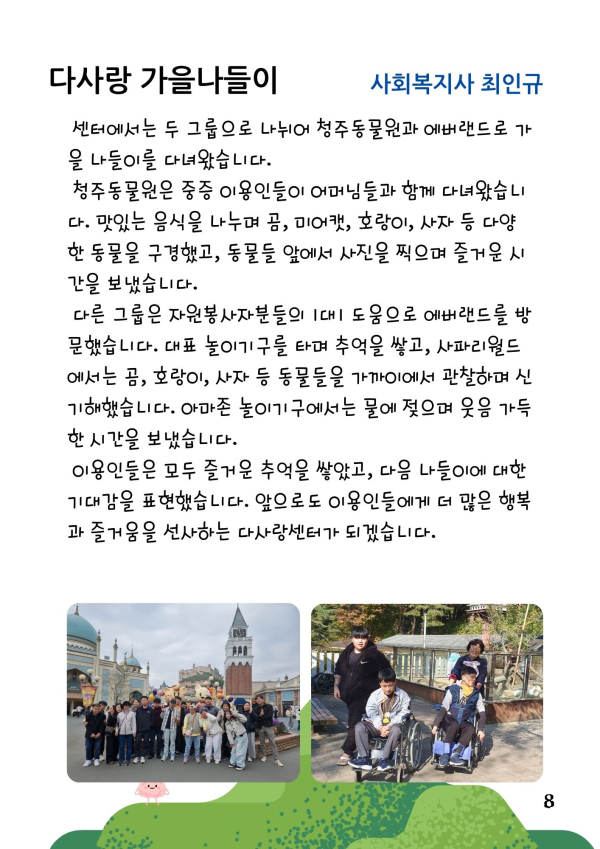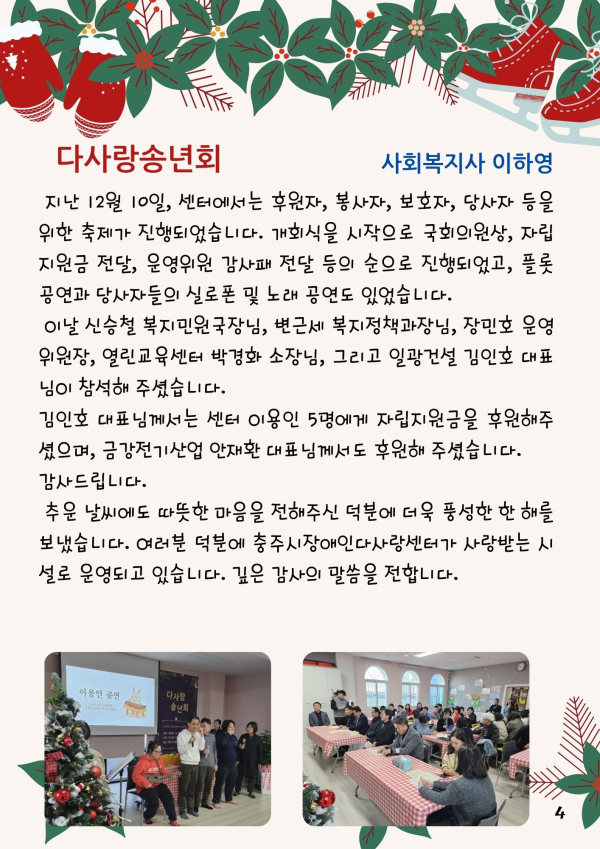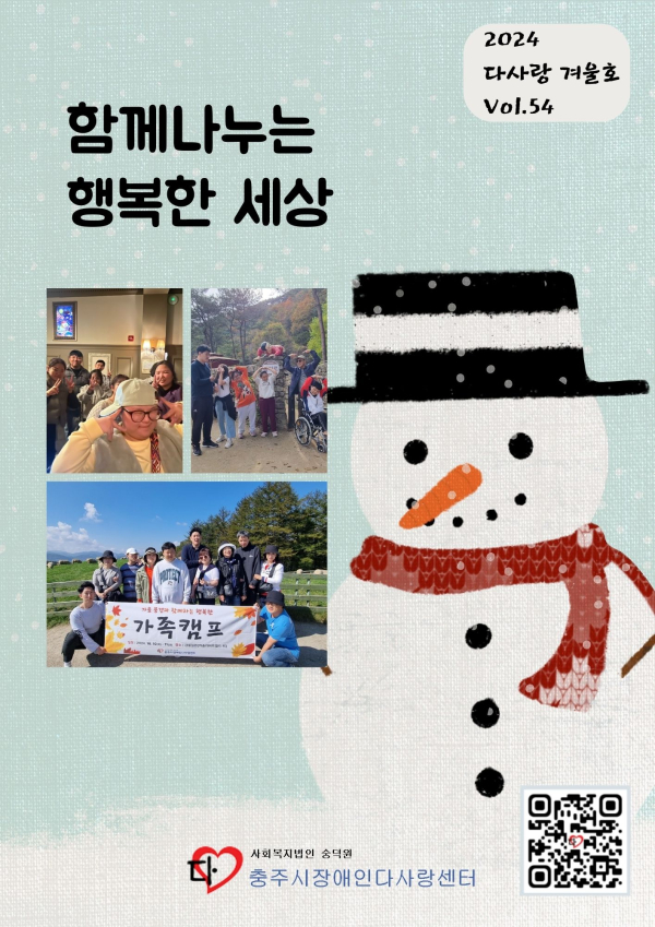 24년 겨울호(vol.54) 다사랑 뉴스레터 페이지 정보 작성자 최월순 작성일25-01-10 14:37 조회448회 댓글0건 관련링크 본문 2024년 다사랑 뉴스레터 '겨울호' 가 발행되었습니다. 지난 한해 큰 관심 가져주신 모든분들께 진심으로 감사드립니다. 댓글목록 등록된 댓글이 없습니다. 이전글 다음글 목록