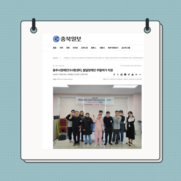 충주시장애인다사랑센터 '주말여가지원사업 간담회' 개최 페이지 정보 작성자 최월순 작성일25-04-23 23:48 조회219회 댓글0건 관련링크 본문 충주시장애인다사랑센터는 주말여가지원사업에 선정 된 발달장애인 10명과 보호자, 타 기관 실무자를 대상으로 사업설명회 및 간담회를 개최했다. 이번사업은 2월부터 11월까지 진행되며, 유명철 원장은 "이번 사업을 통해 발달장애인과 가족들이 더욱 활기찬 여가 생활을 즐기고, 사회적 참여 기회가 확대되길 기대하며 주말 프로그램으로 다양한 체험활동을 지원 할 수있도록 노력하겠다" 고 말했다. 충주시장애인다사랑센터는 발달장애인의 자립훈련을 통해 지역사회 구성원으로써 행복한 삶을 영위할 수 있도록 지원하는 사회복지시설이다. 댓글목록 등록된 댓글이 없습니다. 이전글 다음글 목록